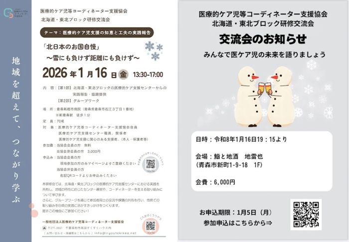 2026年1月16日(金)医療的ケア児等コーディネーター支援協会の北海道・東北ブロック大会が青森市で開催されます。テーマを医療的ケア児支援の知恵と工夫の実践報告とし、各医療的ケア児センターからの取り組みの紹介後、グループワークを通して、自身の地域でできる取り組みや悩み事など意見交換します。